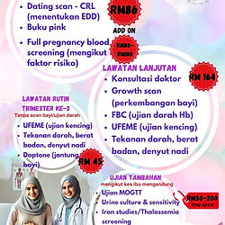 CHARGE ANTENATAL VISIT KLINIK SALAM 2025 FIRST VISIT/BUKA BUKU - RM86 Consult RM20 CRL scan RM48 Antenatal book RM18 Add on Ujian darah RM88-180 LAWATAN LANJUTAN - RM164 Consult antenatal follow up RM15 UFEME RM15 FBC RM35 Growth scan RM99 Film print free* LAWATAN RUTIN 3RD TRIMESTER/CHECK PERUT- RM45 Consult free* UFEME RM15 Fetal Heartbeat RM30